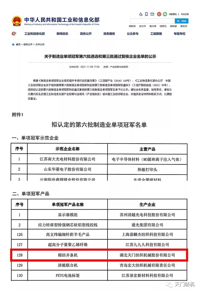 近日,國家工信部和中國工業(yè)經(jīng)濟(jì)聯(lián)合會發(fā)布通知(工信廳聯(lián)政法函〔2021〕95號),擬認(rèn)定天門紡機(jī)并條機(jī)為“單項冠軍產(chǎn)品”。至此,天門紡機(jī)所產(chǎn)的系列并條機(jī)成為了國內(nèi)唯一獲此殊榮的棉紡并條機(jī)。