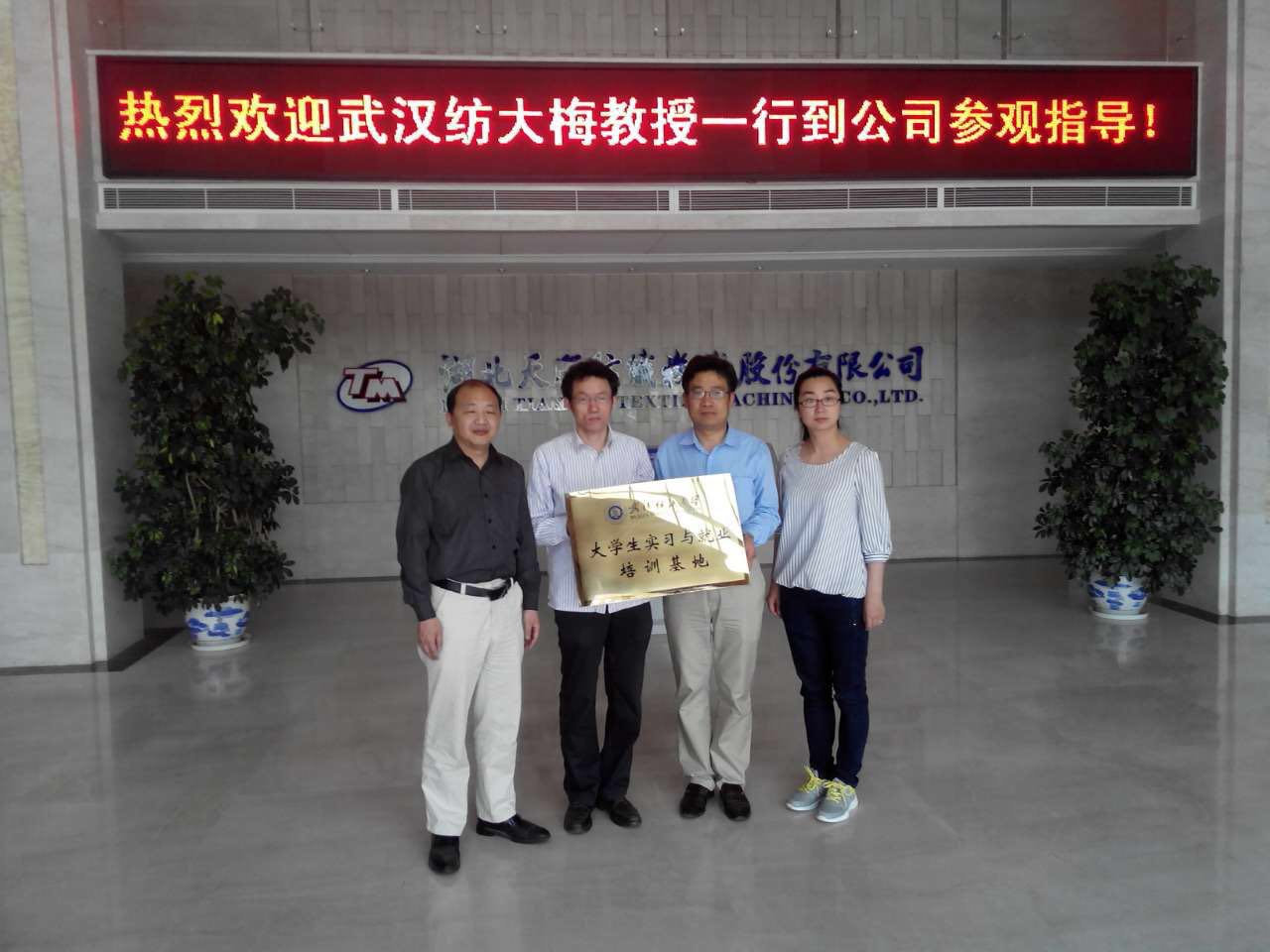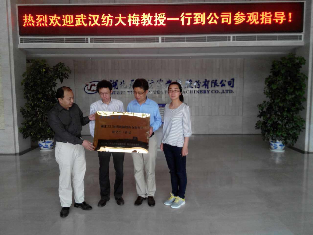 武漢紡織大學攜手天門紡機建立湖北省研究生工作站和大學生實習與就業(yè)基地(從左至右依次為院長梅順齊、執(zhí)行院長燕怒、總工程師鄭強、辦公室主任李靜)