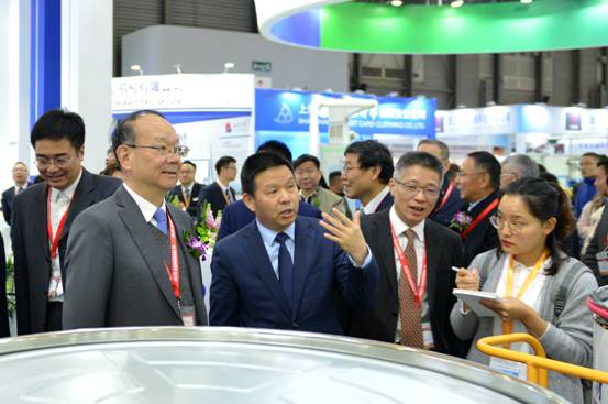 中國(guó)紡織工業(yè)聯(lián)合會(huì)黨委書(shū)記、秘書(shū)長(zhǎng)高勇(左1)聽(tīng)取董事長(zhǎng)沈方勇介紹參展情況