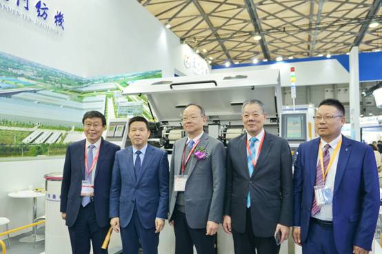 中紡聯(lián)黨委書(shū)記、秘書(shū)長(zhǎng)高勇(左3)、中紡聯(lián)副會(huì)長(zhǎng)楊紀(jì)朝(右2)、中國(guó)紡織機(jī)械協(xié)會(huì)總工程師祝憲民(左1)在天門(mén)紡機(jī)展位上合影