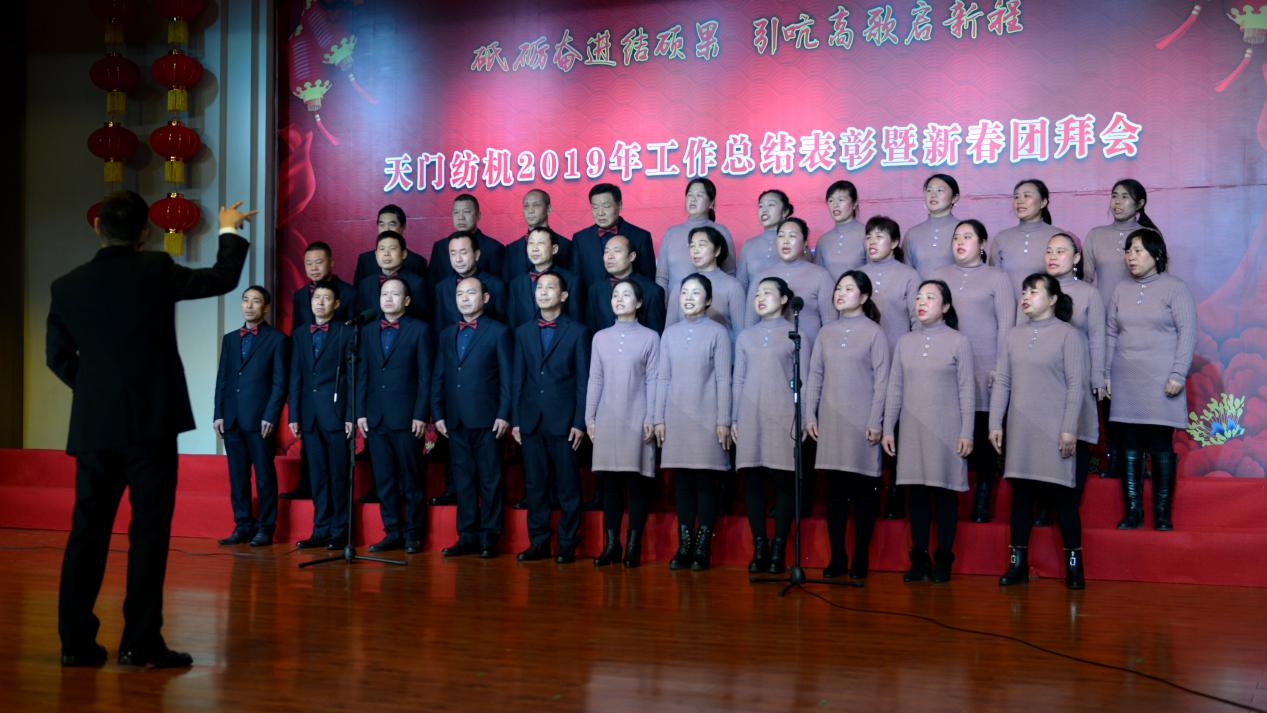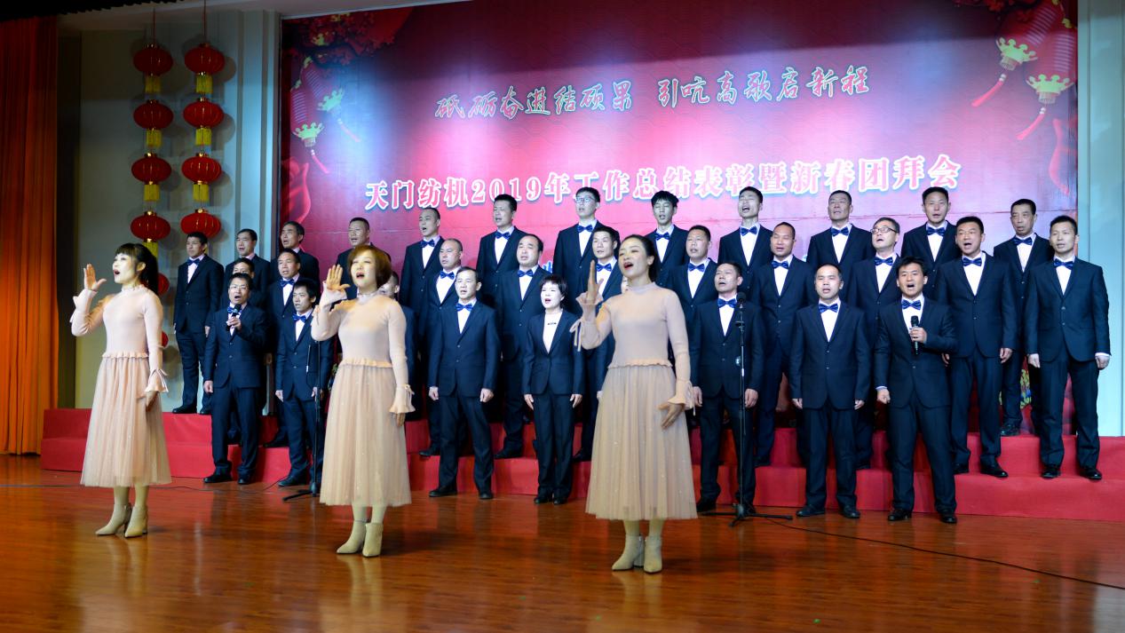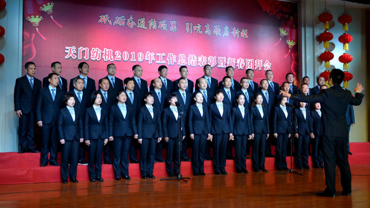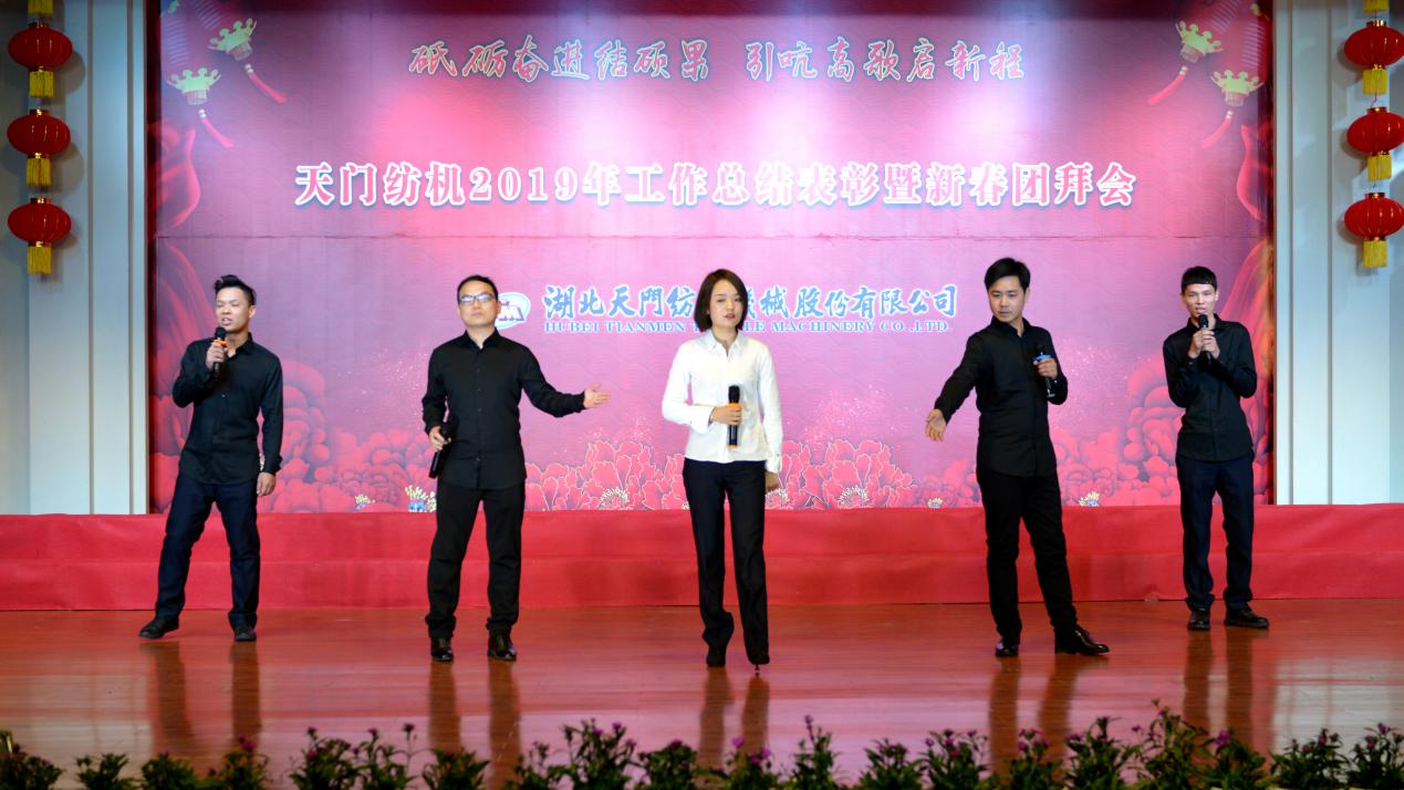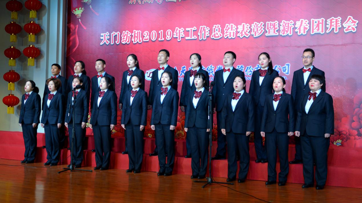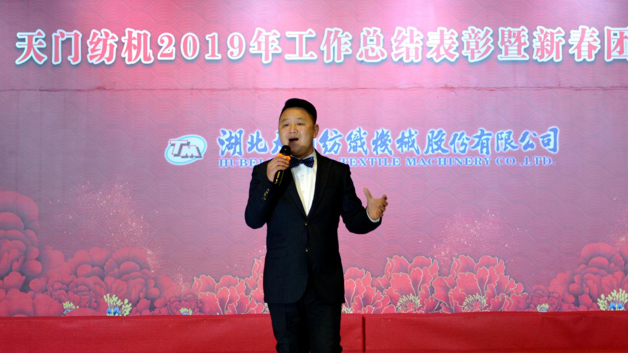 2020年1月21日下午,湖北天門紡織機械股份有限公司綜合樓多功能廳張燈結(jié)彩、暖流融融,一場主題為“砥礪奮進(jìn)結(jié)碩果、引吭高歌啟新程”的年度總結(jié)表彰暨新春團(tuán)拜會在這里舉行,400多名員工身著公司新佩發(fā)的西服套裝,精神奕奕地走進(jìn)會場。13:00整,三位主持人靚妝登場,宣布2019年度總結(jié)表彰暨新春團(tuán)拜會開始。