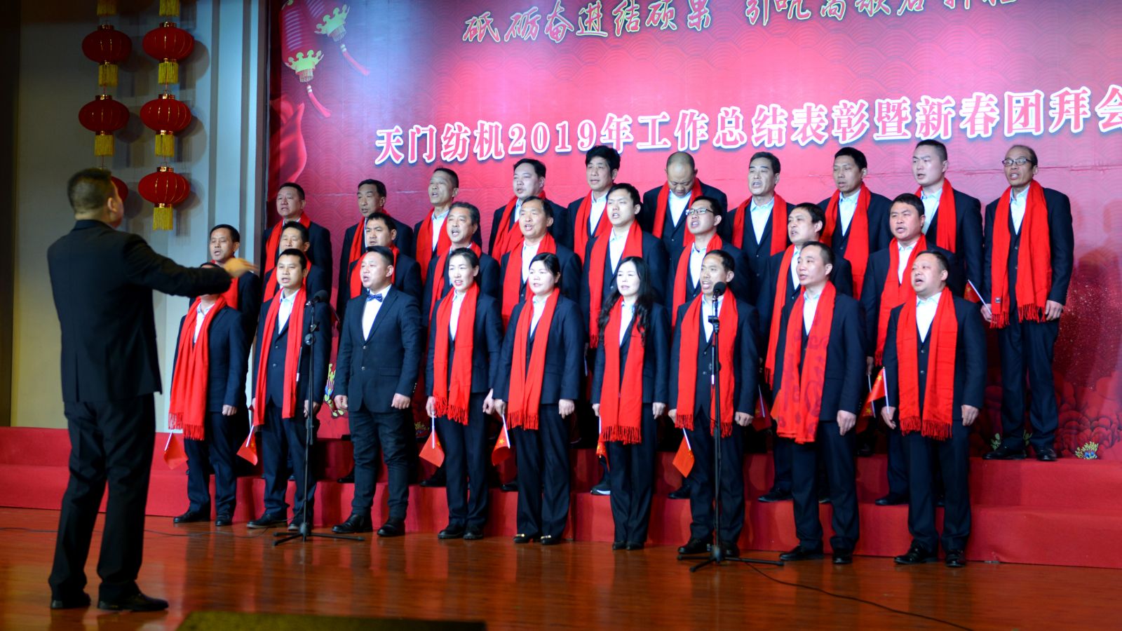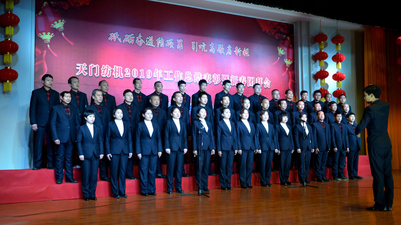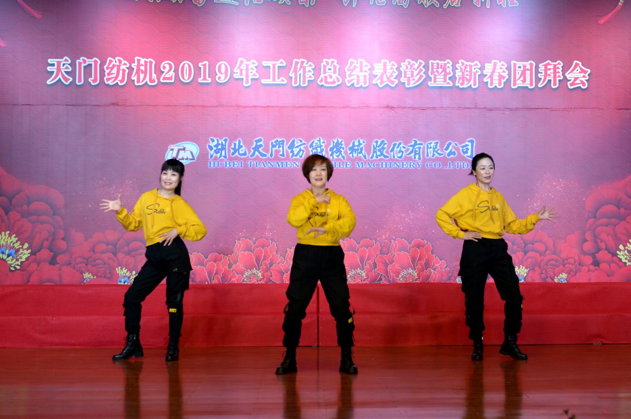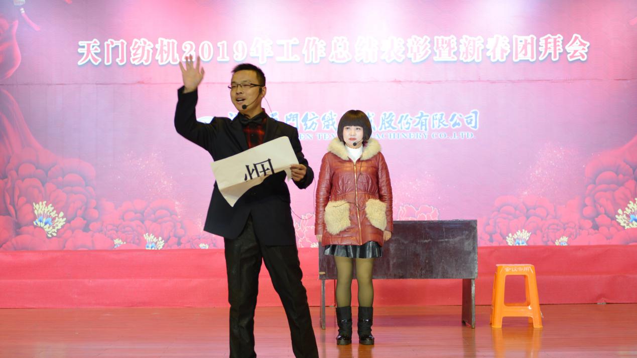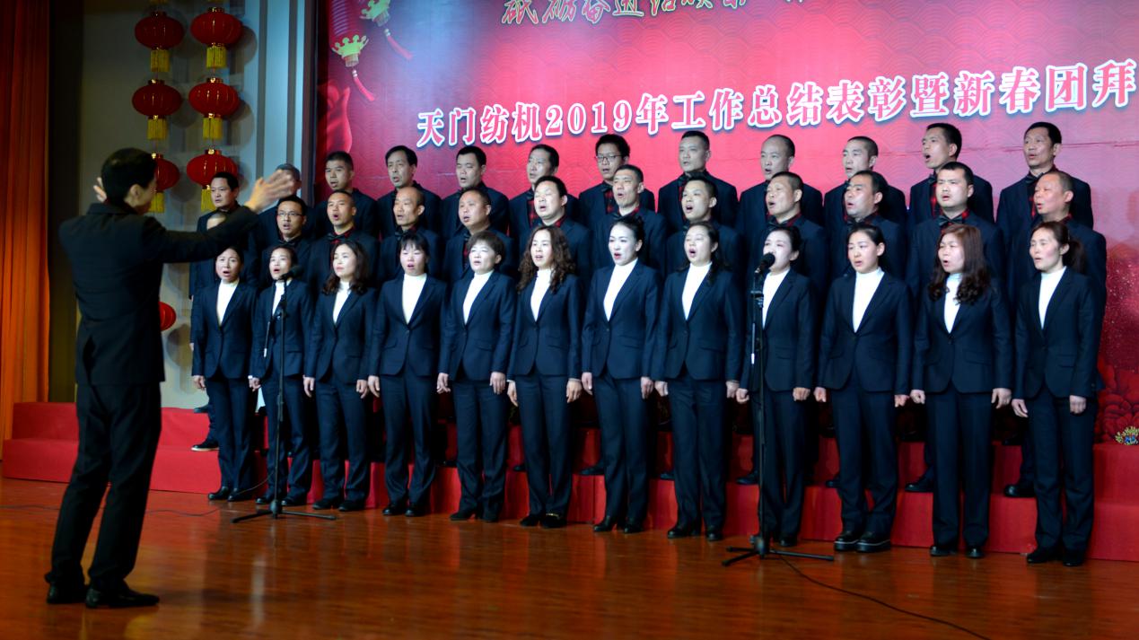 2020年1月21日下午,湖北天門紡織機械股份有限公司綜合樓多功能廳張燈結(jié)彩、暖流融融,一場主題為“砥礪奮進(jìn)結(jié)碩果、引吭高歌啟新程”的年度總結(jié)表彰暨新春團(tuán)拜會在這里舉行,400多名員工身著公司新佩發(fā)的西服套裝,精神奕奕地走進(jìn)會場。13:00整,三位主持人靚妝登場,宣布2019年度總結(jié)表彰暨新春團(tuán)拜會開始。