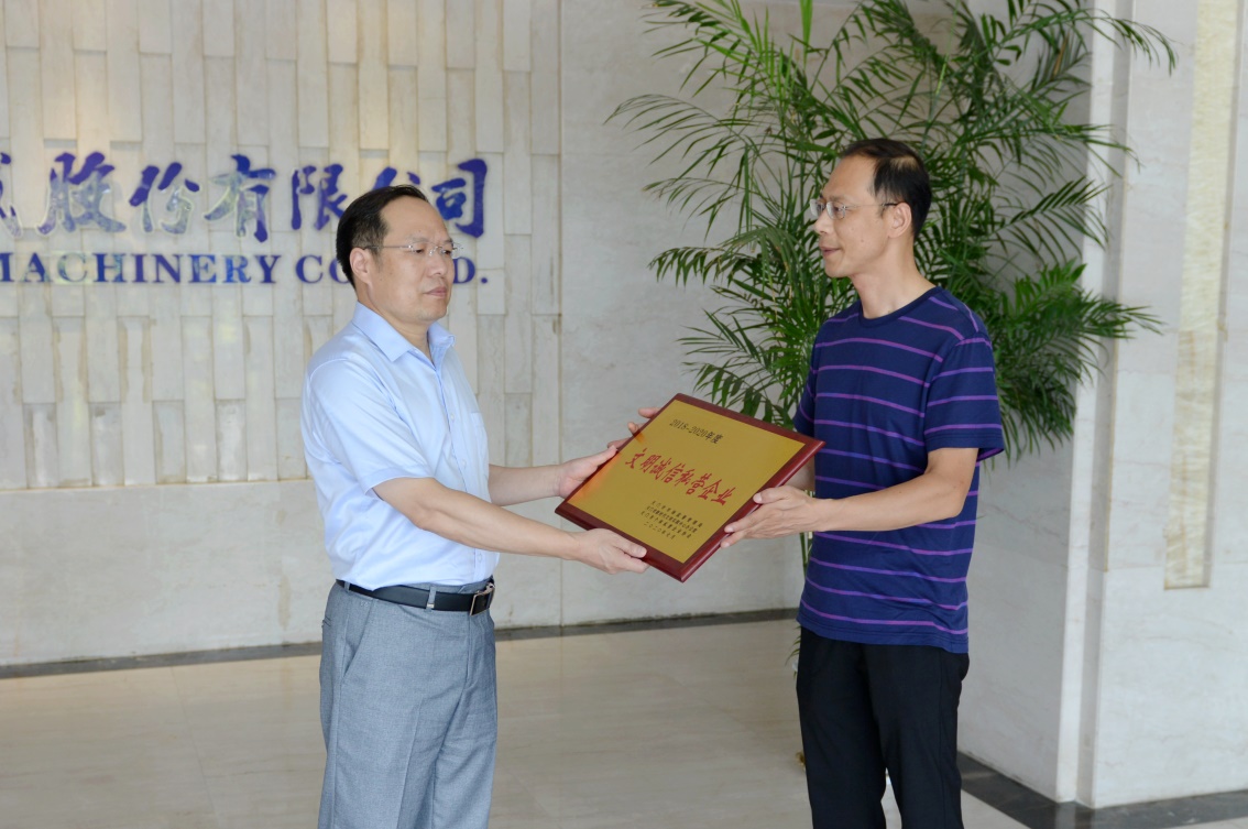8月18日,天門市市場監(jiān)督管理局對天門紡機獲得的"文明誠信私營企業(yè) "榮譽進行現(xiàn)場授牌,黨委書記魯?shù)挛拇砉窘优?。