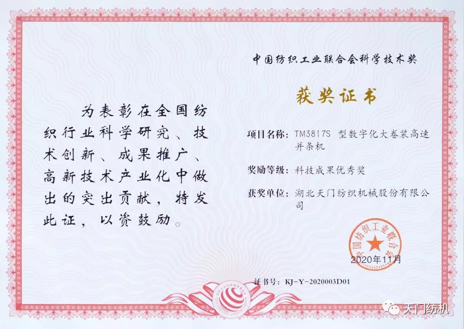 近日,中國紡織工業(yè)聯(lián)合會發(fā)布2020年度科技成果優(yōu)秀獎獲獎通知,并頒發(fā)證書,天門紡機TM3817S型并條機獲評“紡織之光”2020年度中國紡織工業(yè)聯(lián)合會“科技成果優(yōu)秀獎”。鄭強、楊家軒、黃必廣、郭升旗、徐紅、譚鵬飛、沈忱等7名研發(fā)人員獲得個人“科技成果優(yōu)秀獎”