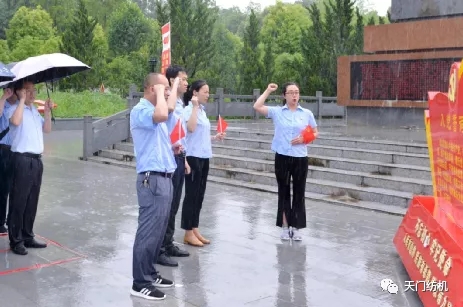上午11點,風雨交加,全體黨員頂風冒雨,整裝列隊,向湘鄂西蘇區(qū)瞿家灣革命烈士紀念碑鞠躬默哀。新老黨員齊舉右手,面向黨旗莊嚴宣誓:“我志愿加入中國共產(chǎn)黨……”錚錚誓言彰顯了永恒初心。