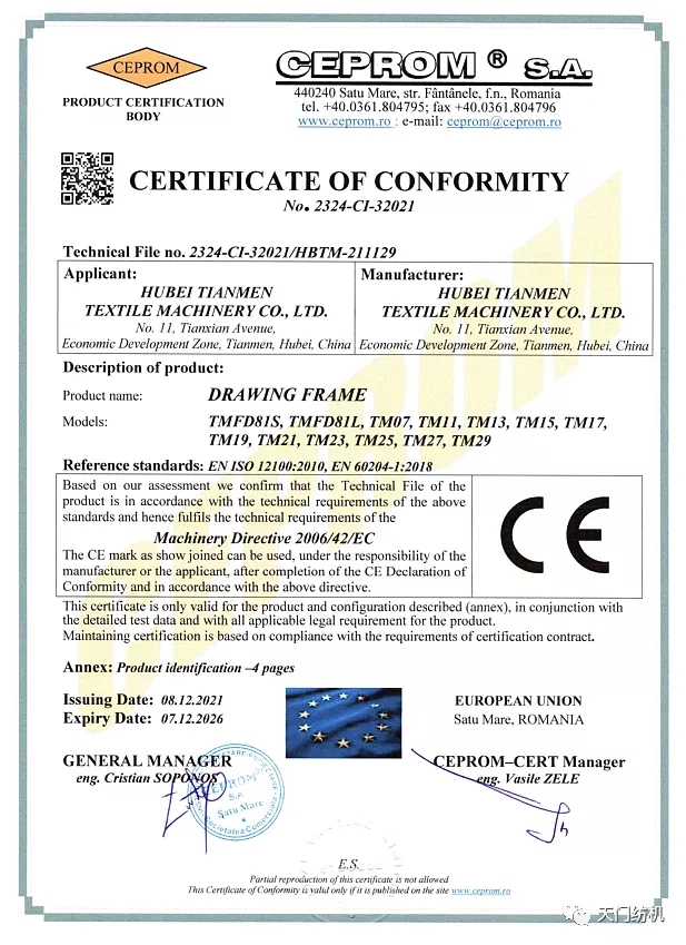 天門紡機(jī)作為擁有歐盟“CE”認(rèn)證證書的高新技術(shù)企業(yè),一直以優(yōu)良的產(chǎn)品質(zhì)量、過硬的質(zhì)控體系以及全球化視野,積極參與國際競爭,并條機(jī)具有進(jìn)入歐盟市場的準(zhǔn)入資格,有力助推了海外市場新增長。