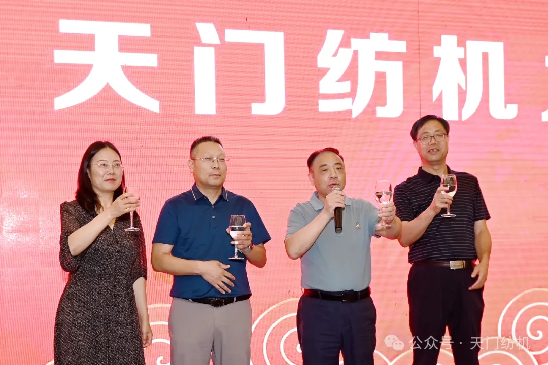陜西省紡織科學(xué)研究院有限公司黨委書記、總經(jīng)理徐遠志,天門紡機總經(jīng)理焦倫進,天門紡機副總經(jīng)理肖少華,《棉紡織技術(shù)》期刊社副總經(jīng)理冉軍麗答謝晚宴共同祝酒