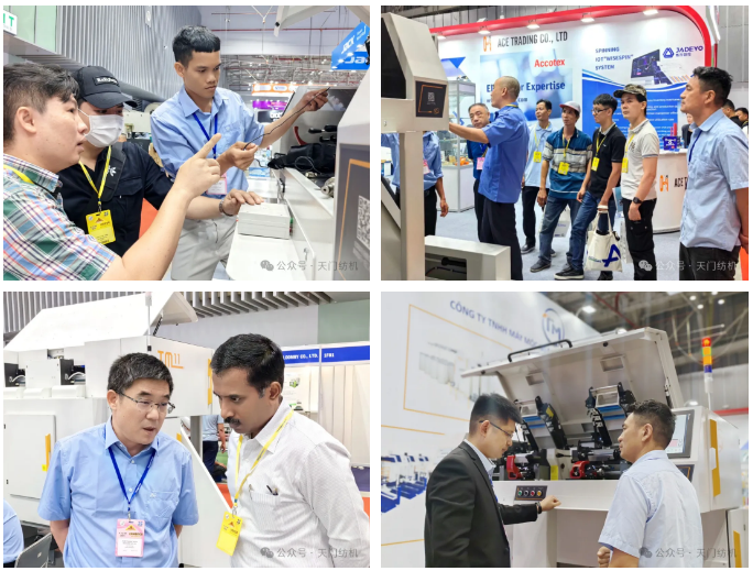 越南展會現(xiàn)場人流如織,其中天門紡機展區(qū)尤為矚目,開展期間分別迎來HANO SIMEX、VICOTEX、HONG LINH、NHA TRANG、THANG CONG、PHU BAI等50余家越南紡企的到訪,T1系列并條機憑借卓越性能表現(xiàn),引發(fā)現(xiàn)場觀眾駐足,多位老客戶對T1系列并條機的穩(wěn)定性與高效產(chǎn)能給予高度評價。