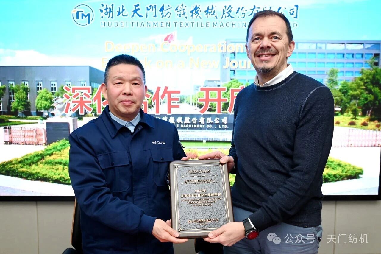 會(huì)議現(xiàn)場(chǎng)同步舉行了授牌和簽約儀式,沈方勇董事長(zhǎng)代表天門紡機(jī)向?yàn)跛固厥谟?ldquo;2025年度并條技術(shù)合作突出貢獻(xiàn)單位”榮譽(yù)牌匾;公司總經(jīng)理焦倫進(jìn)與烏斯特執(zhí)行副總裁、中國(guó)運(yùn)營(yíng)總裁徐斌簽訂新年合作協(xié)議,雙方的合作邁入新階段。